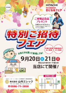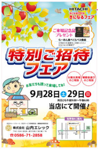 9月20日(土)・21日(日)に山内エレックにて秋の特別フェアを開催いたします。 ご家族・ご近所お誘いあわせの上、ご来場ください。お待ちしています♪お得意様には、順次招待状をお届けいたします♪ お楽しみに!!