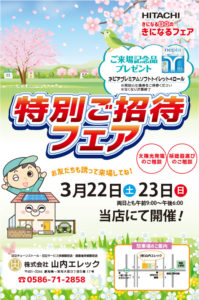 3月22日(土)・23日(日)に山内エレックにて春の特別フェアを開催いたします。 ご家族・ご近所お誘いあわせの上、ご来場ください。お待ちしています♪お得意様には、順次招待状をお届けいたします♪ お楽しみに!!