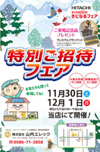 11月30日(土)・12月1日(日)に山内エレックにて冬の特別フェアを開催いたします。ご家族・ご近所お誘いあわせの上、ご来場ください。お待ちしています♪ お得意様には、順次招待状をお届けいたします♪お楽しみに!!
