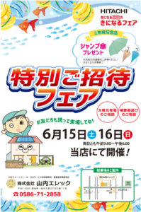 6月15日(土)・16日(日)に山内エレックにて夏の特別フェアを開催いたします。ご家族・ご近所お誘いあわせの上、ご来場ください。お待ちしています♪ お得意様には、順次招待状をお届けいたします♪お楽しみに!!