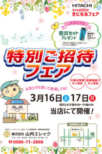 3月16日(土)・17日(日)に山内エレックにて春の特別フェアを開催いたします。ご家族・ご近所お誘いあわせの上、ご来場ください。お待ちしています♪ お得意様には、順次招待状をお届けいたします♪お楽しみに!!