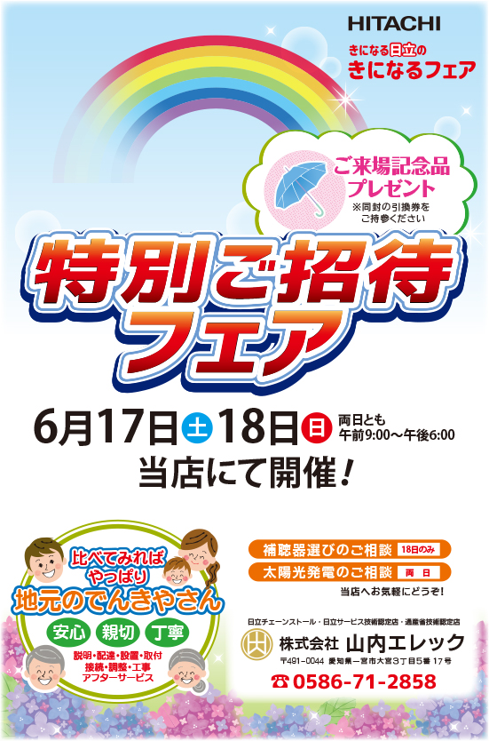きになる日立のきになるフェア 開催します! 2023年5月17日 最終更新日時 : 2025年11月26日 yamauchi 6月17日・18日に山内エレックにて特別フェアを開催いたします。ご家族・ご近所お誘いあわせの上、ご来場ください。お待ちしています♪