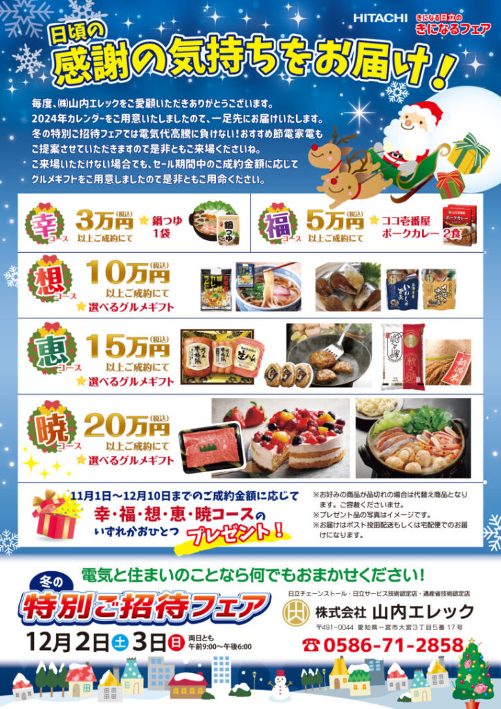 きになる日立のきになるフェアでは、ご購入金額に応じてグルメギフトをプレゼントいたします。フェア当日にご来場いただけない場合でも、セール期間中ならプレゼントをお選びいただけます!!