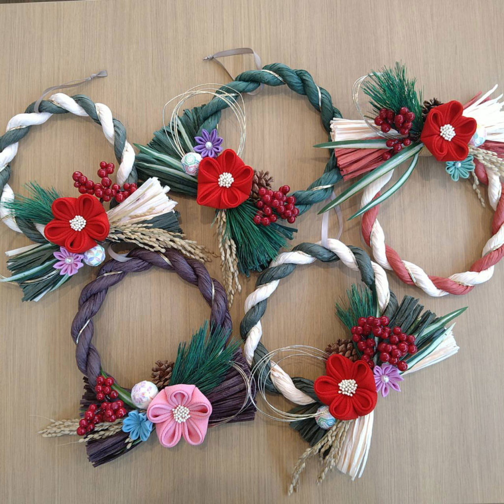 7種類の縁起物を組み合わせて作ったしめ縄飾りや、つまみ細工の技法を学び作ったブローチなど、個性溢れるオリジナル作品を作りました。