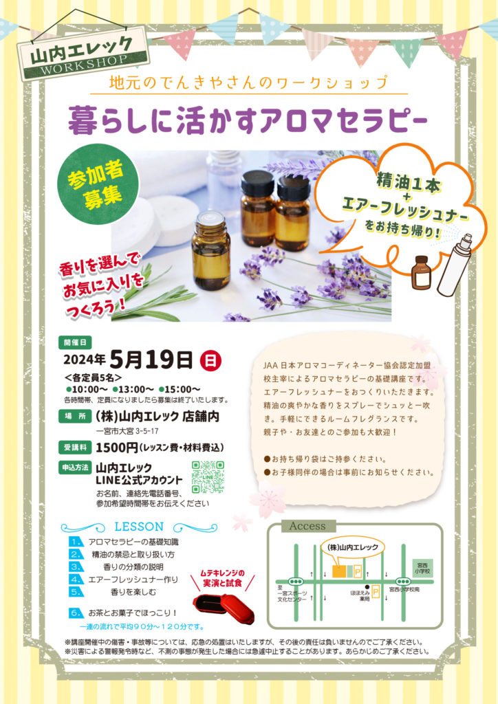 5月19日(日)に山内エレックにて「暮らしに活かすアロマセラピー」ワークショップを開催いたします。